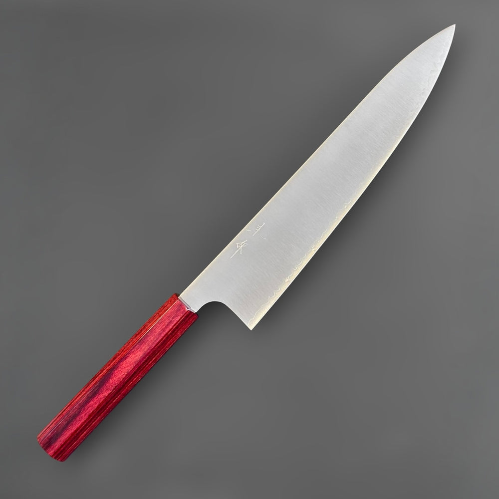 The Kei Kobayashi SG2 Migaki Gyuto 240mm with Red Septagonal Handle is a true laser gyuto built for cooks who want maximum cutting performance with minimal drag. Handcrafted by Kei Kobayashi in Seki, Japan, this knife pairs a thin, high-performance SG2 powdered steel core with stainless cladding and an exceptionally refined migaki finish. The result is a long, lightweight chef’s knife that feels fast, precise, and effortless on the board, whether you are slicing proteins, push-cutting vegetables, or handling large prep sessions.
