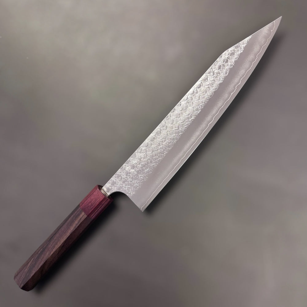 The Yoshimi Kato Minamo SG2 Kiritsuke 240 mm marries next-generation SG2 powdered stainless steel with Kato-san’s signature Minamo hammered ripple finish. The result is a light, laser-thin blade (about 170 g) that glides through protein and produce alike, holds a keen 62–63 HRC edge, and resists corrosion thanks to its stainless cladding. An octagonal rosewood (shitan) handle with red pakkawood ferrule offers comfortable, ambidextrous control, while the long kiritsuke profile excels at push cuts, slicing, and fine vegetable work.