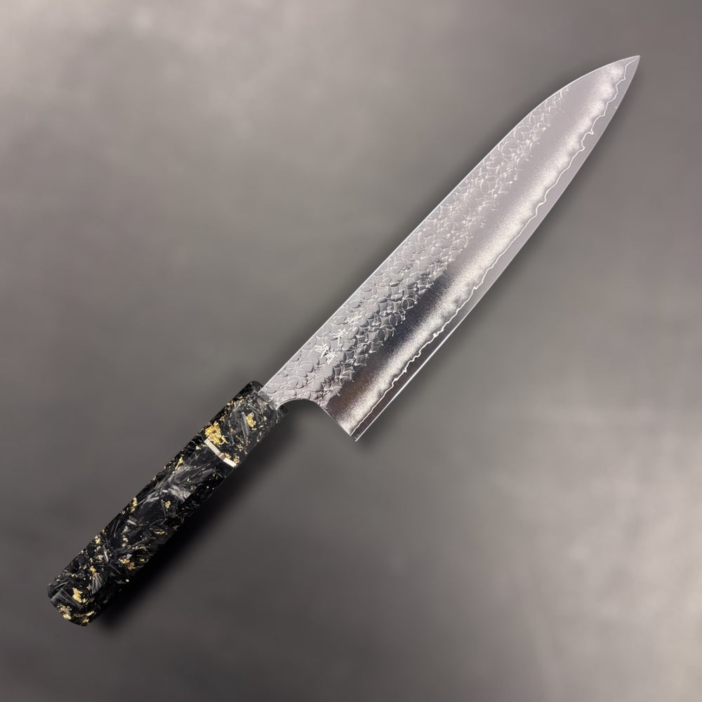The Yoshimi Kato Minamo SG2 Gyuto 210mm is a fast, laser-like chef’s knife from Echizen’s Takefu Knife Village. “Minamo” means water surface—you’ll see it in the hammered ripples that reduce sticking and look stunning under kitchen light. Forged in san-mai construction with a powdered SG2 (R2) stainless core, it delivers elite edge retention with low-maintenance stainless cladding. Our Tokushu Knife edition features a premium carbon-fiber, gold-fleck octagonal wa-handle for superb balance and a modern, grippy feel. If you want a one-knife workhorse for push cuts, rock chops, and fine tip work, this 210 is dialed in.